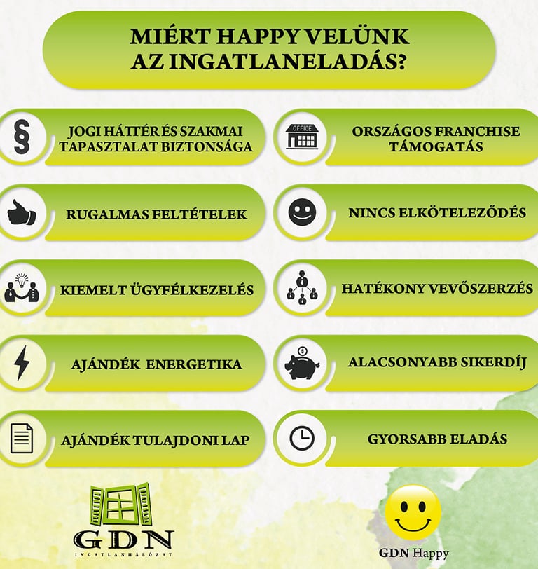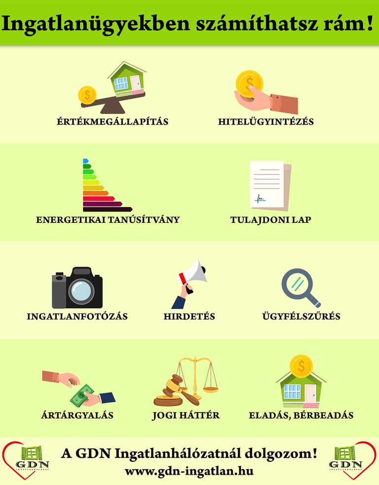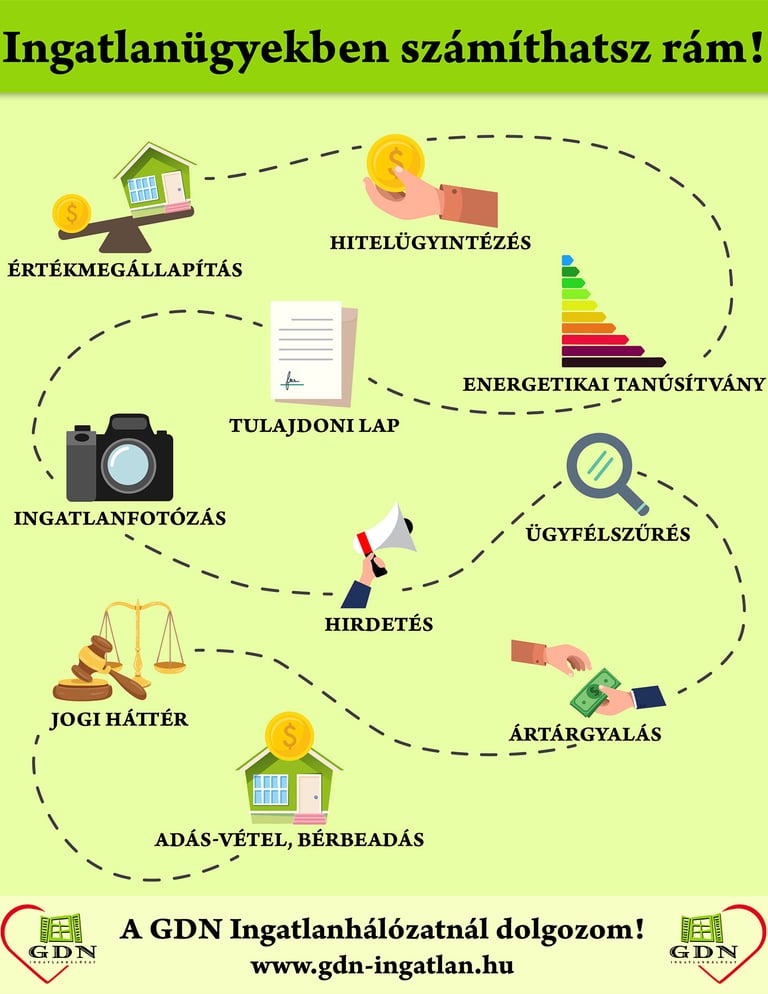 Országszerte több irodánk is van. Az ingatlanközvetítői szakma nagyon szines, roppant változatos háttérrel rendelkező emberek dolgoznak a GDN-nél, legyen az nyugalmazott iskolaigazgató, vagy épp három diplomás mérnök, sokan szeretnek bele ebbe a szakmába és mindenki hozzáadja a maga személyiségét és szaktudását - én magam ügyvédként jogi segítséget tudok közvetlen nyújtani - de az irodában dolgozik ingatlanforgalmi szakértő, mérnök, tolmács, még autóversenyző is. Bármilyen probléma merül fel két három telefonnal már megis találjuk azt az embert aki számára a mi problémánk nem probléma csak egy mindennapi feladat.